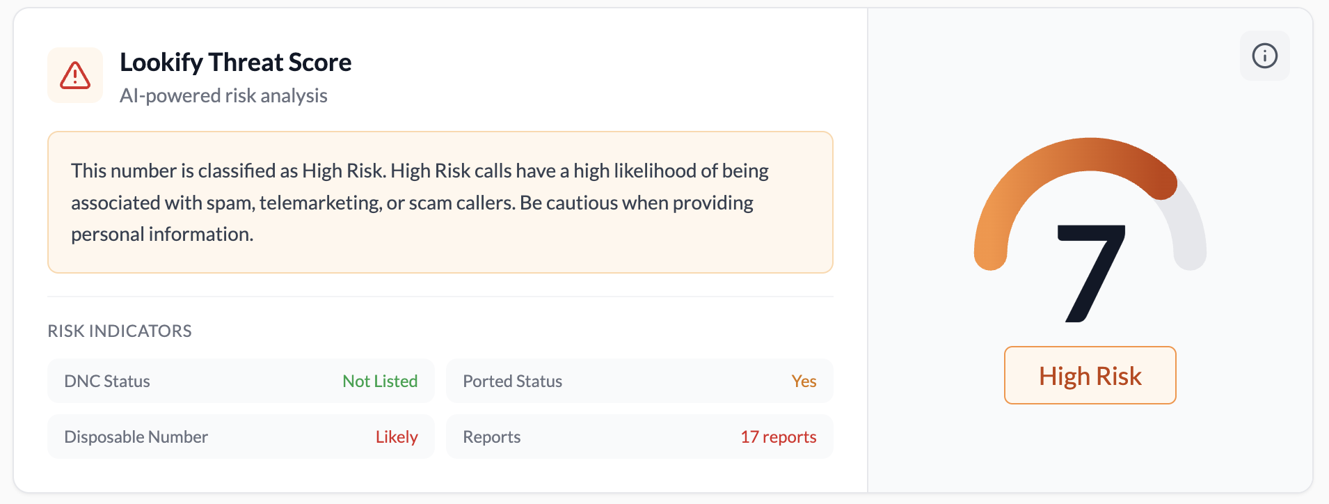 - Threat: Returns the fully revamped Lookify Threat Score, including burner detection. Use this when you are screening for fraud or spam risk without needing the additional person data.