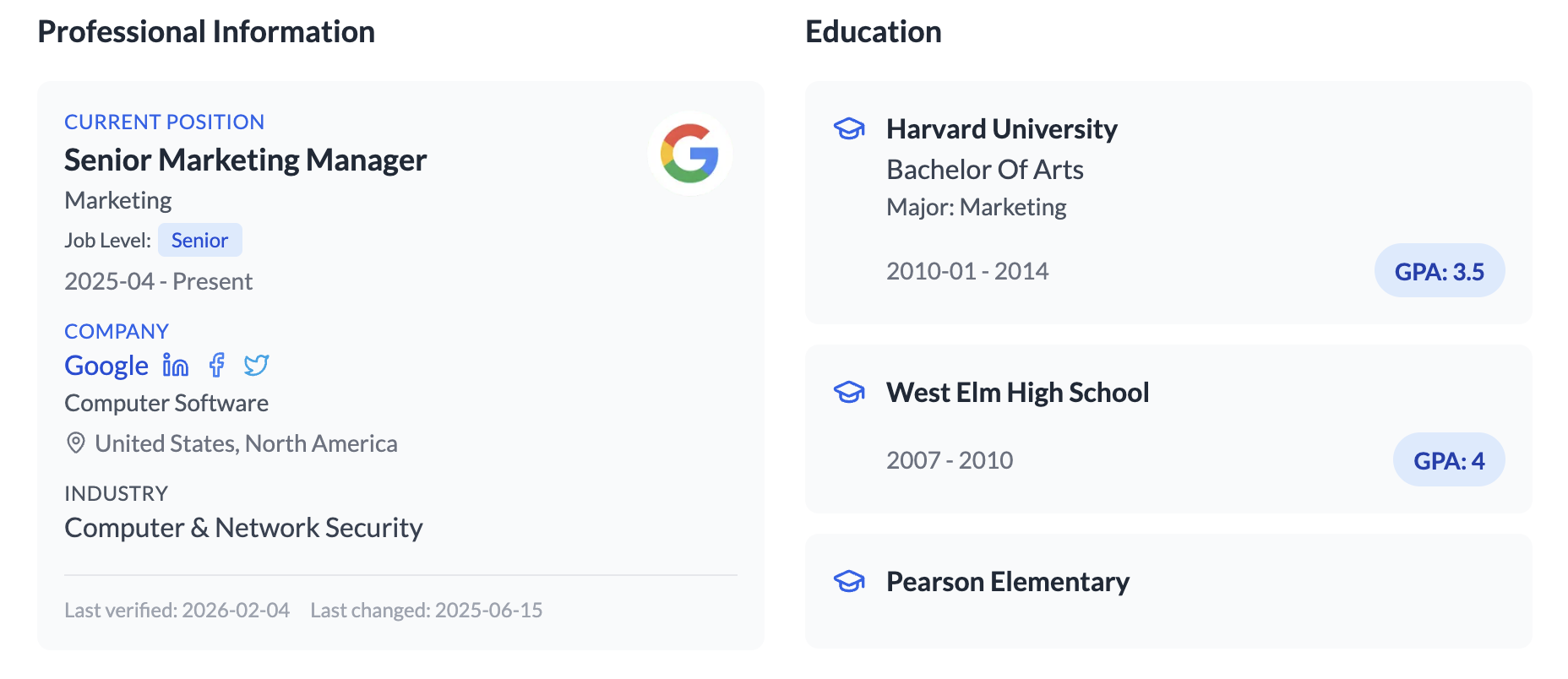 Education records can include institutions attended, fields of study, and degrees earned (as well as GPA). Career history shows current and past employers, job titles, and the timeline of someone's professional background. Certifications and professional skills appear as their own separate data points (when they exist).
