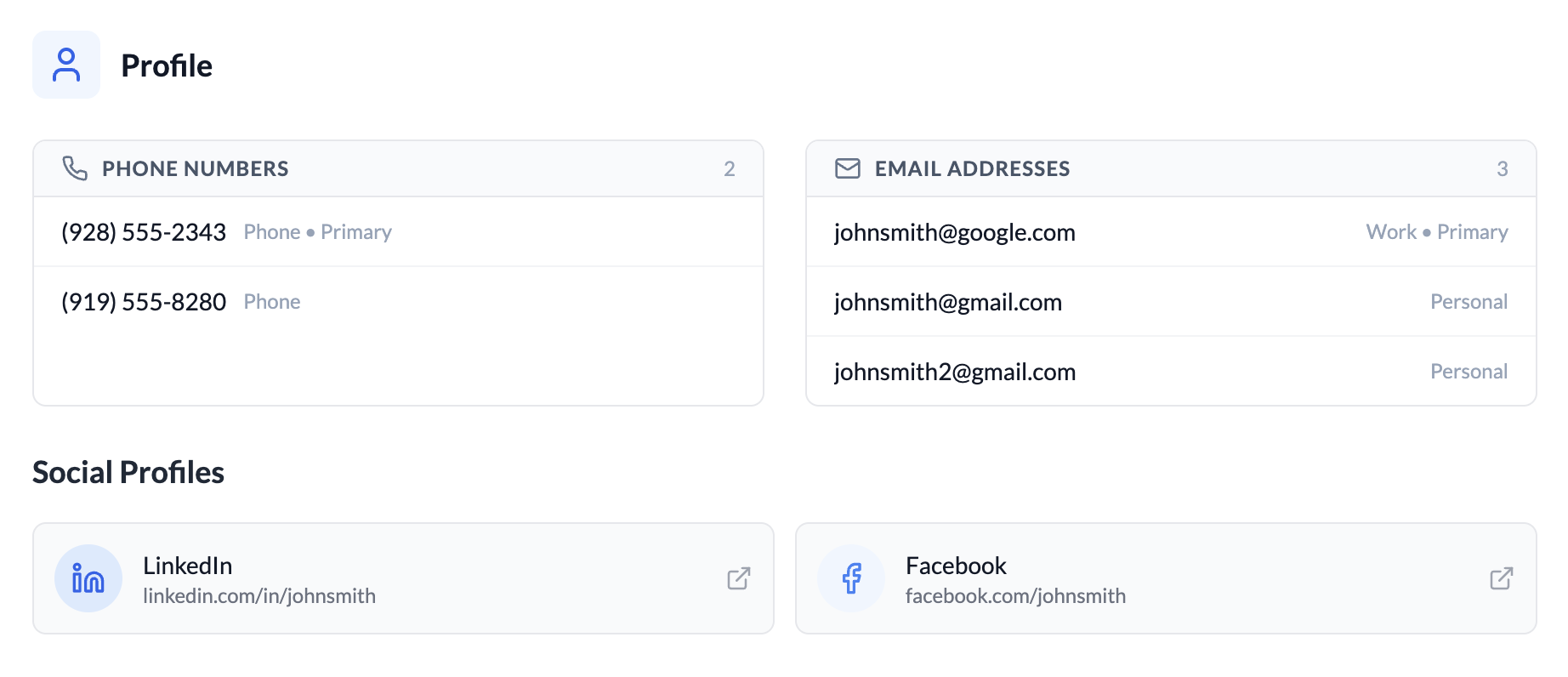 - Person Pro: Returns everything in Person Lite plus alternate emails and phone numbers, social media profile links, education history, career and employment data, and certifications where available. This is the most comprehensive search we offer.