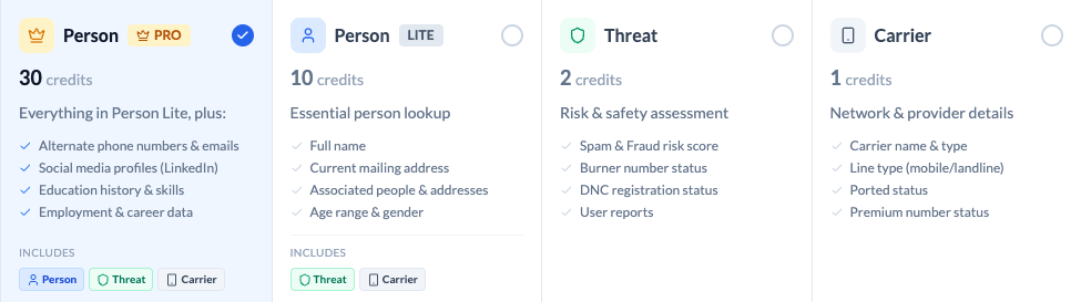 The specialized search types work to your advantage. A fraud team running millions of Threat Score checks monthly no longer has to spend extra credits on data they don't need. A sales team that needs complete contact enrichment gets the full picture in a single Person Pro search. Each search type is built around a specific data need so you're never paying for information you didn't ask for.